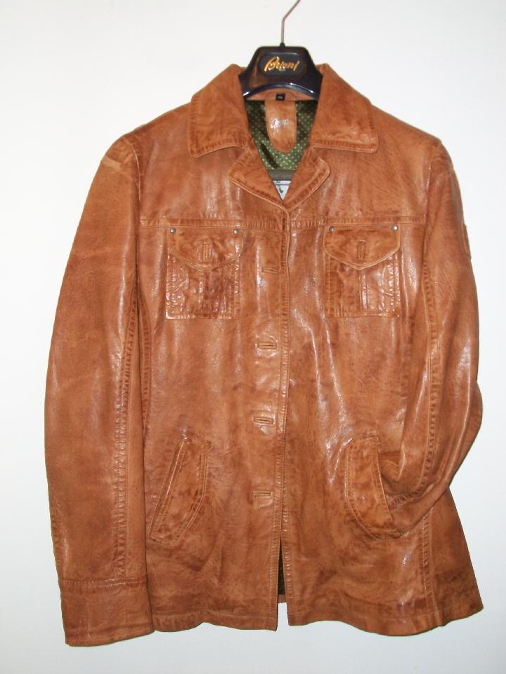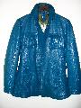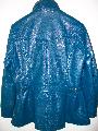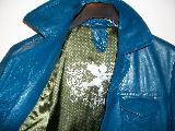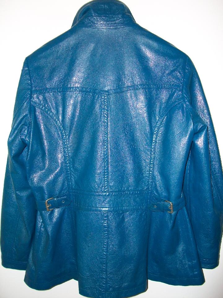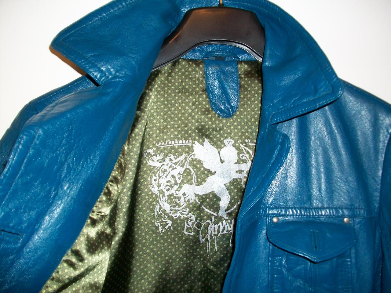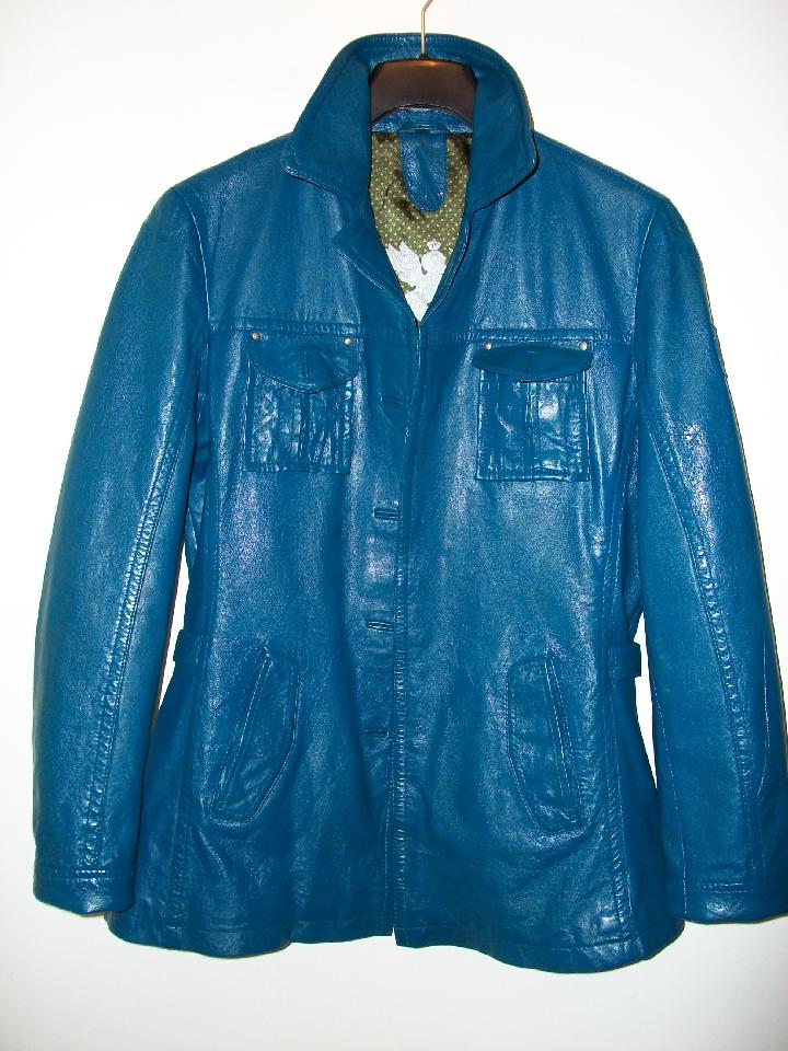 Die braune Ziegenlederjacke wurde in diesen speziellen blauen Farbton nach Wunsch der Kundin umgefärbt.